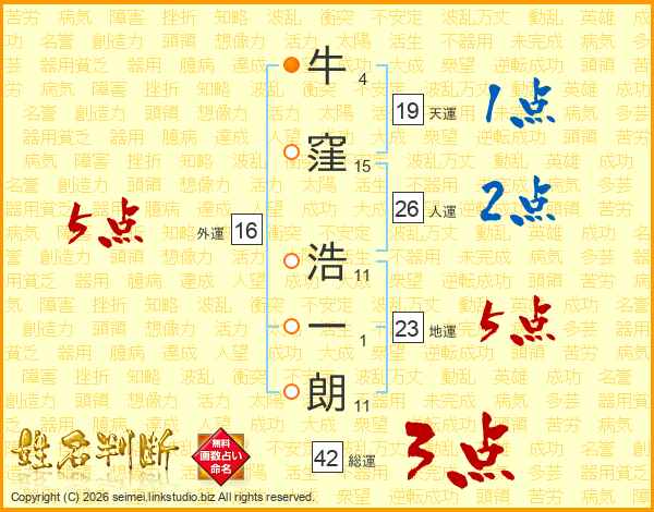 牛(4画)窪(15画) 浩(11画)一(1画)朗(11画)
