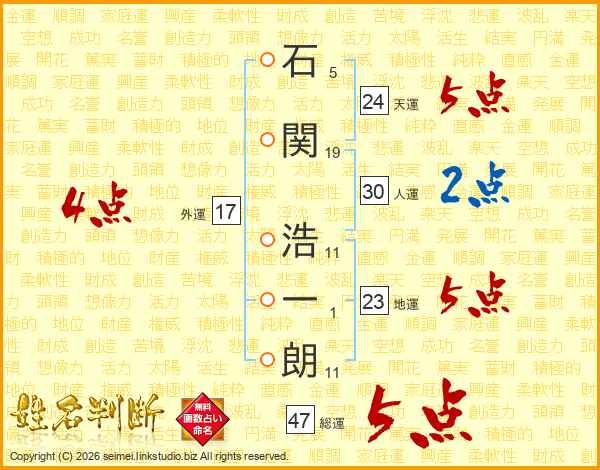 石(5画)関(19画) 浩(11画)一(1画)朗(11画)