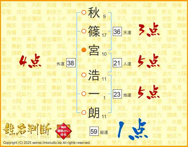 秋(9画)篠(17画)宮(10画) 浩(11画)一(1画)朗(11画)
