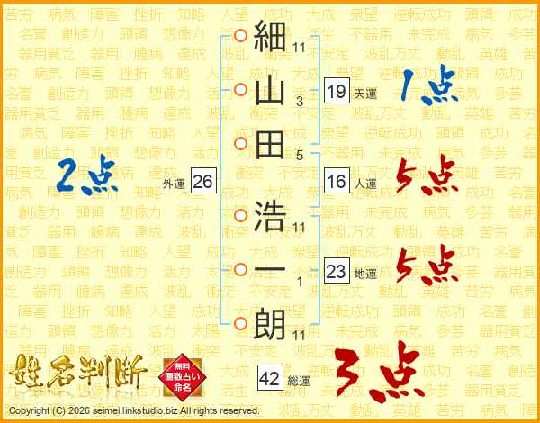 細(11画)山(3画)田(5画) 浩(11画)一(1画)朗(11画)