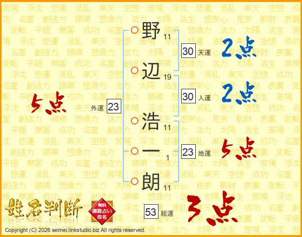 野(11画)辺(19画) 浩(11画)一(1画)朗(11画)