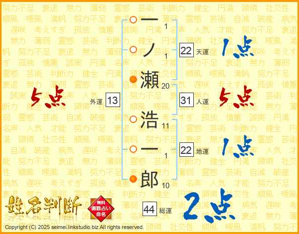 一ノ瀬浩一郎さんの総運は44画の2点!