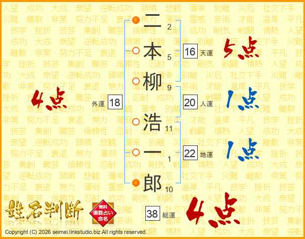 二本柳浩一郎さんの総運は38画の4点!