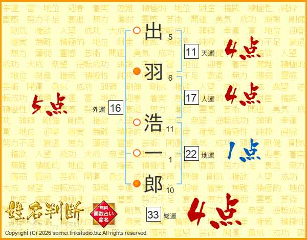 出(5画)羽(6画) 浩(11画)一(1画)郎(10画)