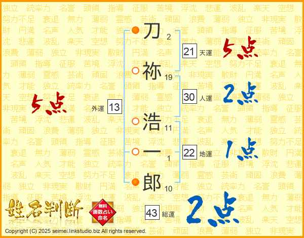 刀(2画)祢(19画) 浩(11画)一(1画)郎(10画)