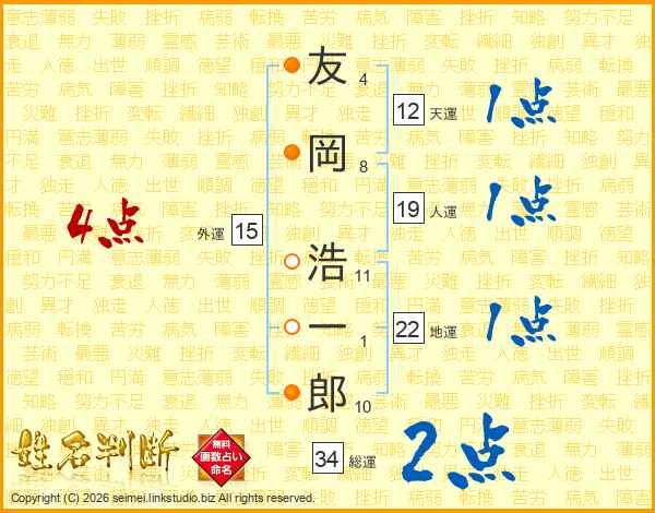 友(4画)岡(8画) 浩(11画)一(1画)郎(10画)