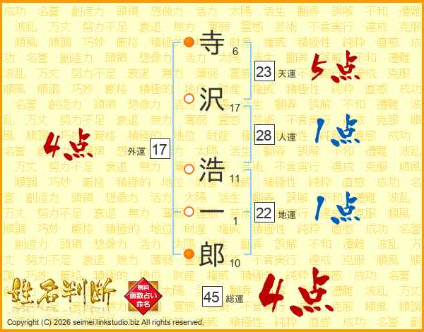 寺(6画)沢(17画) 浩(11画)一(1画)郎(10画)
