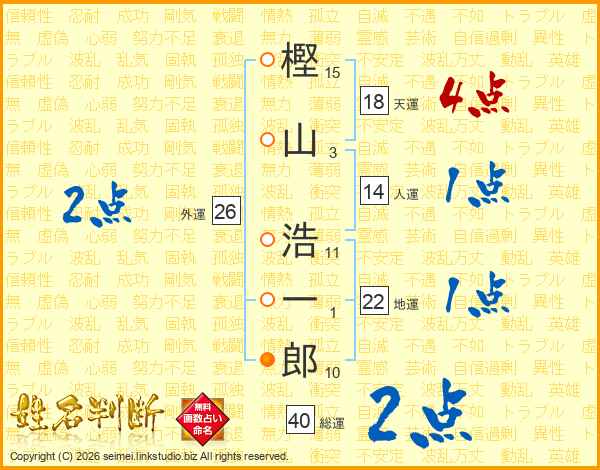 樫(15画)山(3画) 浩(11画)一(1画)郎(10画)