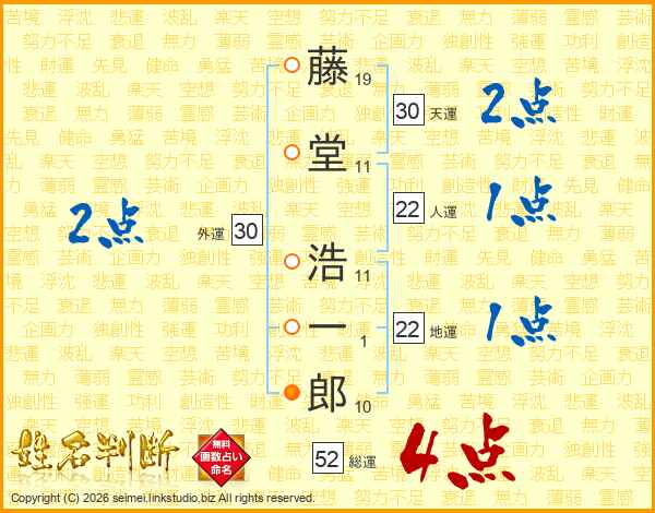 藤堂浩一郎さんの総運は52画の4点!