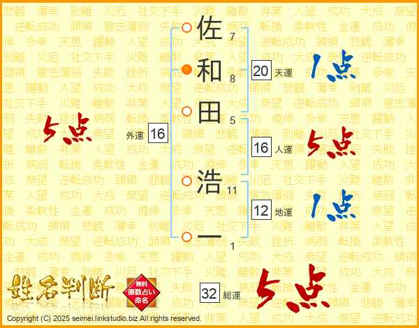 佐和田浩一さんの総運は32画の5点!