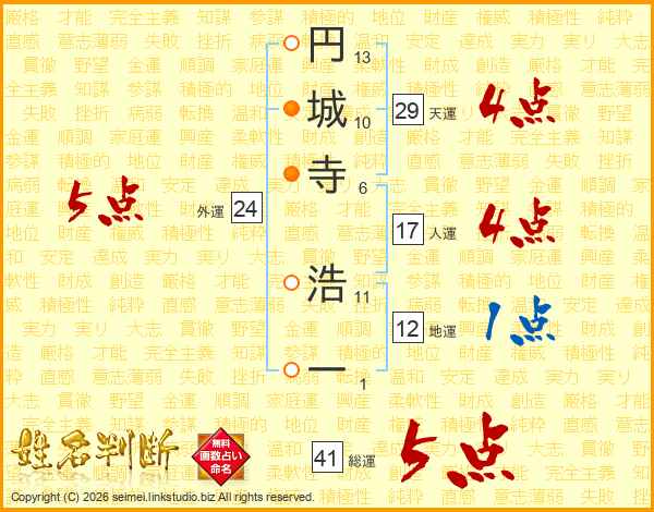 円(13画)城(10画)寺(6画) 浩(11画)一(1画)