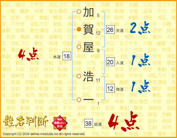 加(5画)賀(12画)屋(9画) 浩(11画)一(1画)