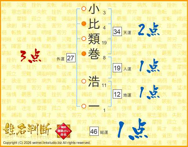 小(3画)比(4画)類(19画)巻(8画) 浩(11画)一(1画)