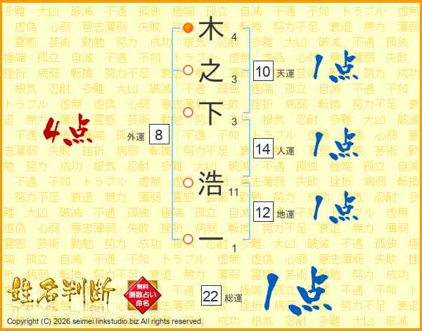 木(4画)之(3画)下(3画) 浩(11画)一(1画)