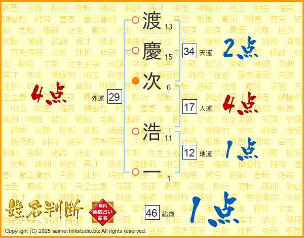 渡(13画)慶(15画)次(6画) 浩(11画)一(1画)