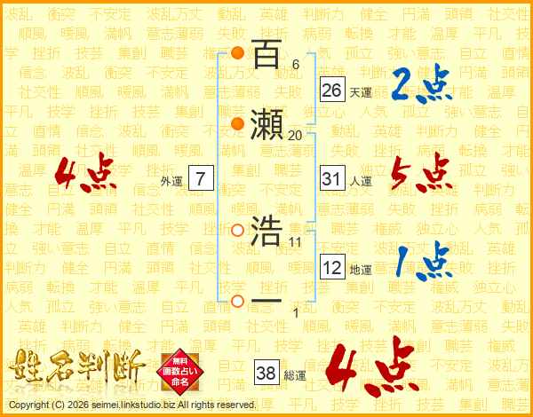 百(6画)瀬(20画) 浩(11画)一(1画)