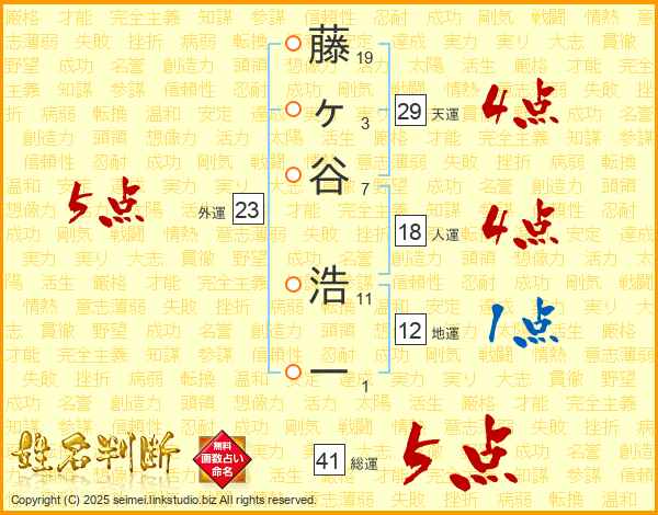 藤(19画)ヶ(3画)谷(7画) 浩(11画)一(1画)