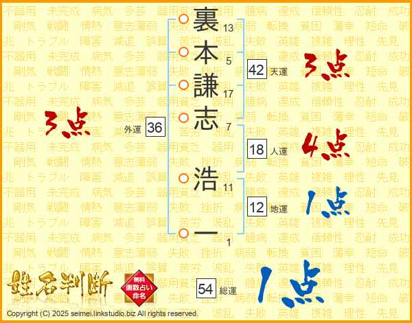 裏本謙志浩一さんの総運は54画の1点!