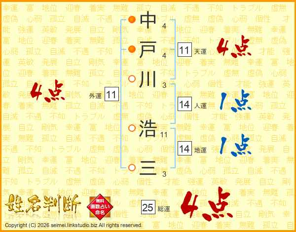 中(4画)戸(4画)川(3画) 浩(11画)三(3画)