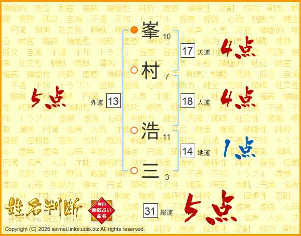 峯(10画)村(7画) 浩(11画)三(3画)