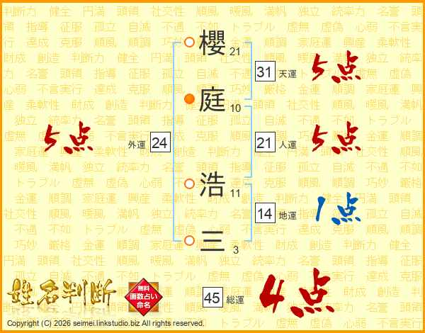 櫻(21画)庭(10画) 浩(11画)三(3画)