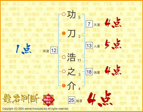 功(5画)刀(2画) 浩(11画)之(3画)介(4画)