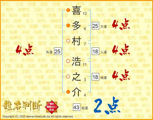 喜(12画)多(6画)村(7画) 浩(11画)之(3画)介(4画)