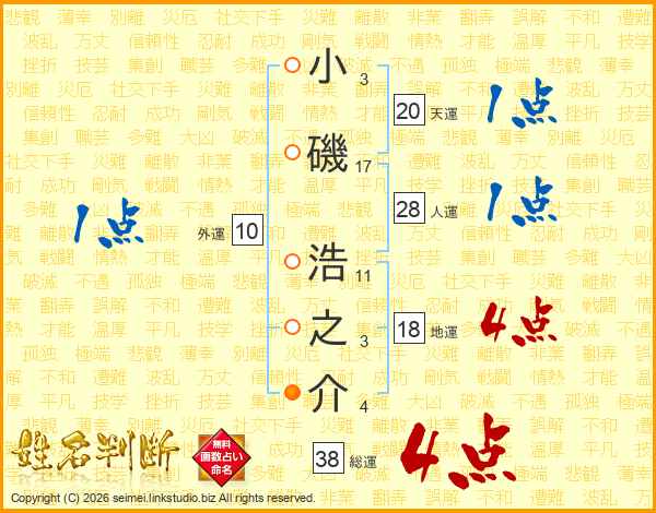 小(3画)磯(17画) 浩(11画)之(3画)介(4画)