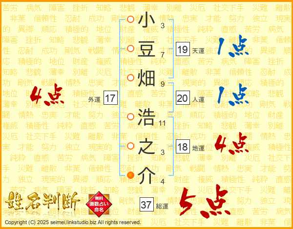 小(3画)豆(7画)畑(9画) 浩(11画)之(3画)介(4画)