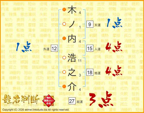木(4画)ノ(1画)内(4画) 浩(11画)之(3画)介(4画)