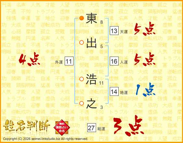 東(8画)出(5画) 浩(11画)之(3画)