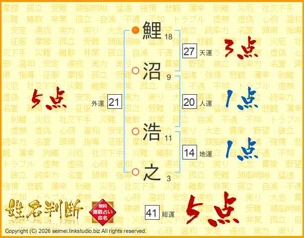鯉(18画)沼(9画) 浩(11画)之(3画)