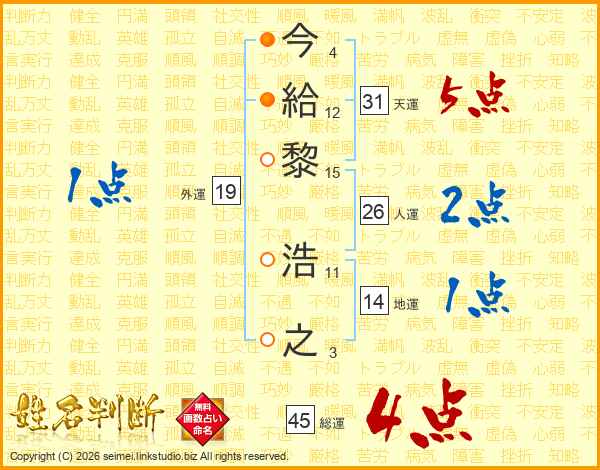今(4画)給(12画)黎(15画) 浩(11画)之(3画)