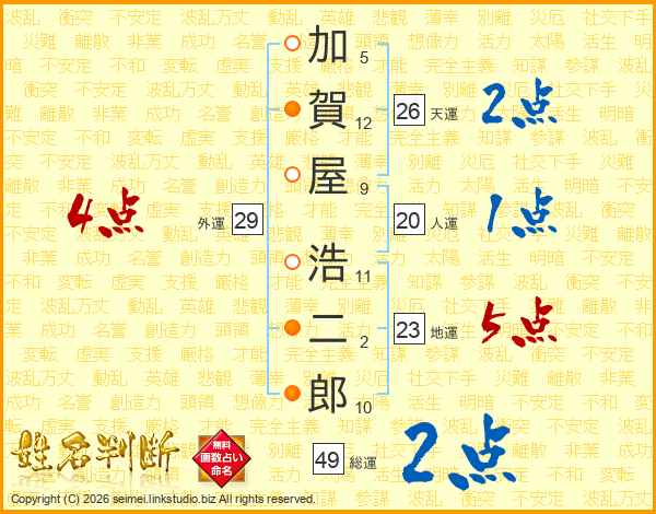 加(5画)賀(12画)屋(9画) 浩(11画)二(2画)郎(10画)