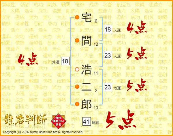 宅間浩二郎さんの総運は41画の5点!
