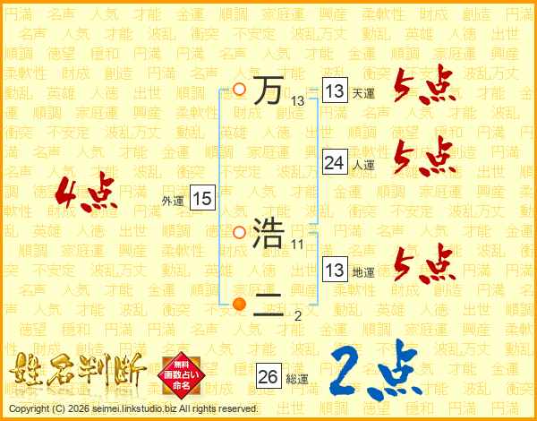 生活面を象徴する運勢です。外部から受ける影響力を表し、結婚運、家庭運や職場、環境への順応性を表します。総運から人運を引いた画数。姓や名が1文字の場合を除く。