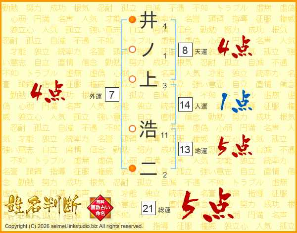 井(4画)ノ(1画)上(3画) 浩(11画)二(2画)