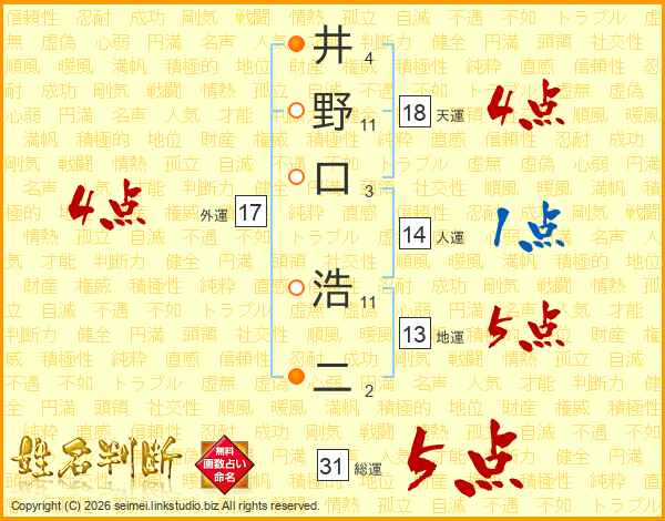 井(4画)野(11画)口(3画) 浩(11画)二(2画)