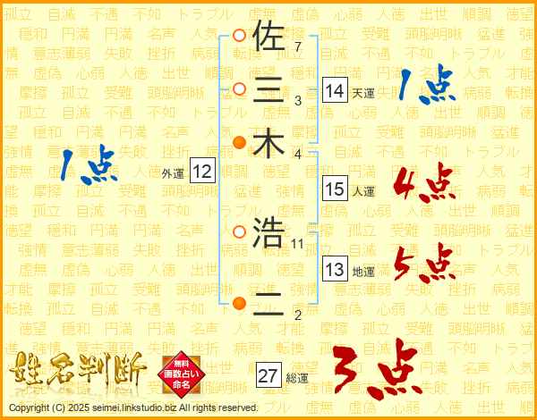 佐(7画)三(3画)木(4画) 浩(11画)二(2画)