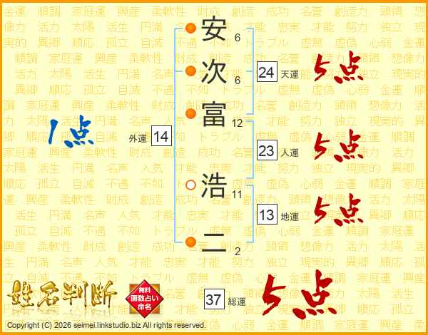 安(6画)次(6画)富(12画) 浩(11画)二(2画)