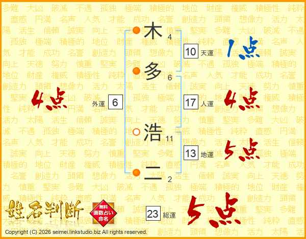 木多浩二さんの総運は23画の5点!