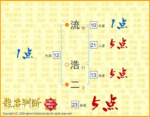 流浩二さんの総運は23画の5点!