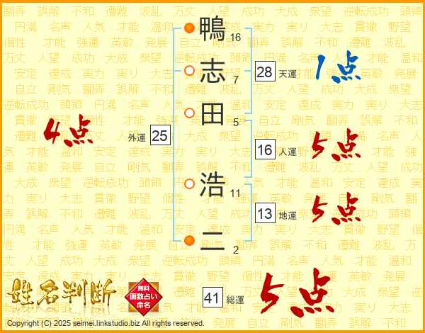 鴨(16画)志(7画)田(5画) 浩(11画)二(2画)