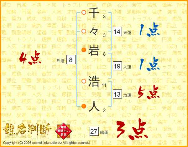 千々岩浩人さんの地運は13画の5点!