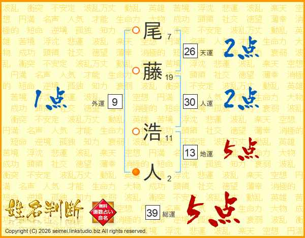 尾(7画)藤(19画) 浩(11画)人(2画)