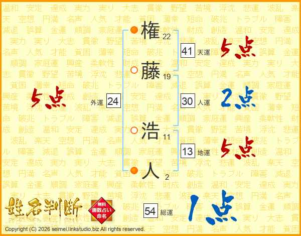 権(22画)藤(19画) 浩(11画)人(2画)