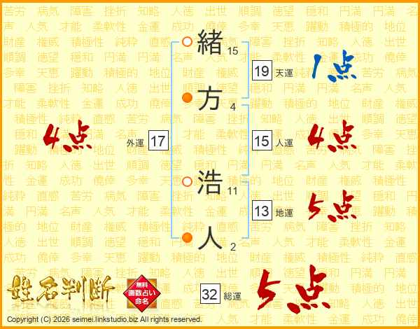 緒(15画)方(4画) 浩(11画)人(2画)