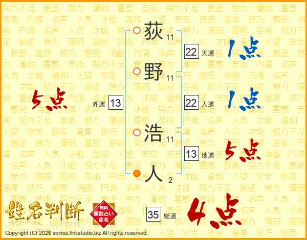荻野浩人さんの人運は22画の1点!