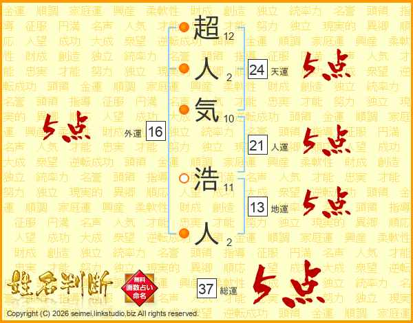 超(12画)人(2画)気(10画) 浩(11画)人(2画)