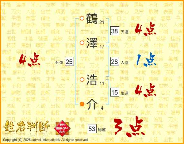 鶴澤浩介さんの天運は38画の4点!